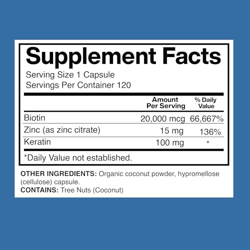 Biotin 20,000mcg with Keratin, Coconut Powder and Zinc, Hair Growth Supplements, Biotin Supplements, Healthy Hair Skin & Nails for Adults,120 Veggie Capsules, 120 Day Supply