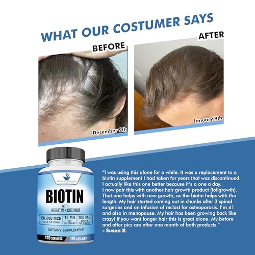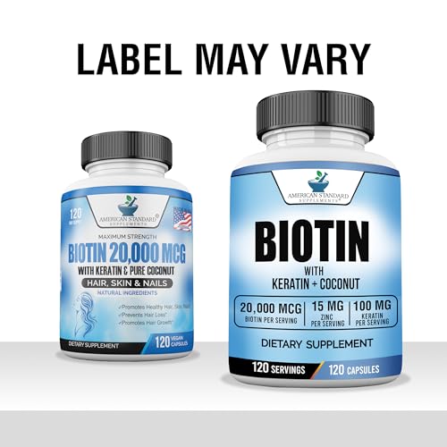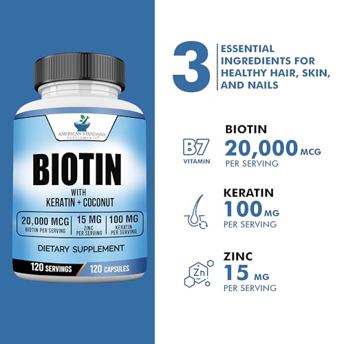 Healthy Hair, Nail Growth: American Standard Supplements’ Biotin offers the highest potency in the market. One capsule contains 20,000mcg of Biotin (Vitamin B-7) with Keratin, Coconut Powder and Zinc. One bottle is for 120 day supply. Just take one capsule per day for your hair and skin health!
